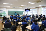 <交通安全教室(1年生)> 1年生を対象に交通安全教室を開催しました。南但馬警察署 交通課の中井警部補から交通マナーについて、映像を見ながら分かりやすくお話していただきました。 |