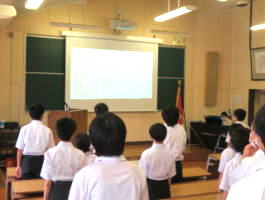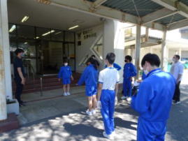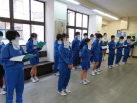 | ◇7月29日(金)<夏休みボランティアB【希望者】> ・本日は、子育て学習センターと学童クラブを訪問しました。 ![]() ![]() ![]() ◇7月27日(水)<夏休みボランティアA【希望者】> ・本日は、生野地域センターと学童クラブを訪問しました。 ![]() ![]() ![]() ◇7月26日(火)<夏休みボランティア@【希望者】> ・夏休み中に一人1回程度、町内の施設4カ所(生野地域センター・子育て学習センター・生野こども園・学童 クラブ)を訪問し、ボランティア活動を行います。本日は、学童クラブを訪問しました。 ![]() ![]() ![]() ◇7月20日(水)<第2回 「19の日ボランティア活動」> *詳細は生徒会ページ参照 ![]() ![]() ![]() ◇7月20日(水)<離任式:ALT(Scott Corwin Phelan)【全校生】> ・令和元年8月から3年間、ALTとして生野中学校中心に小学校やこども園にもお世話になりました。 このたびの任期満了にともない帰国されることとなりました。ありがとうございました。 ![]() ![]() ![]() ![]() ![]() ![]() 【集合写真(1年生)】 【集合写真(2年生)】 【集合写真(3年生)】 ![]() ![]() ![]() ◇7月19日(火)<大掃除・ワックがけ【全校生・美化保健委員会】> (目的)1学期にわたり生活してきた校舎への感謝する心をもち、一人一人が責任をもって清掃活動に取り組む 中で、働くことの意義を理解させる。 ![]() ![]() ![]() ![]() ![]() ![]() ◇7月19日(火)<体育祭結団式【全校生】> *詳細は生徒会を参照。 *スローガン『戮力協心(りくりょくきょうしん) 〜心を一つに勝利を掴め〜 』 《白組》 《紅組》 ![]() ![]() ◇7月14日(木)<特別支援学級交流(小中連携)> ・小中連携事業として、本学級生徒と生野小学校の児童と合同で、生野郵便局に出かけ七夕の短冊づけを行ま した。素敵な願いが叶うといいですね。 ![]() ![]() ![]() ![]() ![]() ![]() ◇7月12日(火) <花壇・花づくり> ・『花に囲まれた校舎に!!』 ・・・玄関前の花壇をお花畑に改良中です。 ![]() ![]() ![]() ![]() ![]() ![]() ◇7月8日(金)<租税教室【3年生】> ・和田山税務署職員の玉山 真人さんをお迎えして、社会科の授業の一つとして「税について」 学習を行いました。 ![]() ![]() ![]() ![]() ![]() ![]() ![]() ![]() ![]() ◇7月8日(金)<歯科衛生指導(ハハハの会)【1年生】> ・歯の健康に対する意識を高め、自己管理できる能力を養う目的に実施しました。 (内容) ・虫歯や歯周病、正しいブラッシングについて学ぶ。 (講師) ・歯科衛生士 高木 妙子さん・小西 悦子さん(2名) ![]() ![]() ![]() ![]() ![]() ![]() ◇7月7日(木)<出前おさかな講習会【3年生】> ・県内で漁獲される魚の種類・時期・主な漁法や漁業を取り巻く環境等の基本を学ぶ。 また、魚を見る・触る・おろすという体験を通して、兵庫県で漁獲される魚のおいしさを伝え、地産地消・魚 食文化の伝承と海の恵みに感謝する心を育む目的で実施しました。 (内容) ・魚の三枚おろし・ソテーの実習、兵庫の漁業についての学習 (講師) ・兵庫県漁業協同組合連合会 SEAT−CLUB 川端 寿美香さん・米澤 良子さん(2名) ![]() ![]() ![]() ![]() ![]() ![]() ![]() ![]() ![]() ![]() ![]() ![]() ◇7月6日(水)<1学期オンライン授業の実施【全校生】> ・新入生も含めたオンライン授業の実施を行い、今後のタブレット端末を活用した家庭学習や学級閉鎖等に 対応できるように準備をする目的で実施しました。 ○1年生【数学】(比と比例式) ![]() ![]() ![]() ![]() ![]() ![]() ○2年生【理科】(言葉2) ![]() ![]() ![]() ![]() ![]() ![]() ○3年生【社会】(現代社会「効率と公正」) ![]() ![]() ![]() ![]() ![]() ![]() ◇7月5日(火)<但馬総体壮行会【全校生】> *詳細は生徒会を参照。 ・7月9日から開幕する但馬中学校総合体育大会への激励としての壮行会を行いました。 ![]() ![]() ![]() ◇7月5日(火)<読み聞かせ【1・2年生】> ・朝のホームルームの時間を使って、おはなしの会(みみうさぎ)から岡田さんと青田さんをお迎えして、2年 ぶりとなる絵本の読み聞かせを行いました。 ![]() ![]() ![]() ![]() ![]() ![]() ◇7月1日(金)<第1回19(いくの)の日【希望者】> *詳細は生徒会ページを参照。 ![]() ![]() ![]() ◇7月1日(金)<生野踊り講習会【全校体育】> ・本年度、第1回目となる生野踊り講習会を開催しました。昨年度に引き続き、講師には、生野町在住の 太幸五朗(1区)、松本みゆき(2区)氏をお招きしました。体育祭で披露する予定にしています。 ![]() ![]() ![]() ![]() ![]() ![]() |