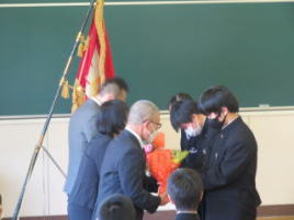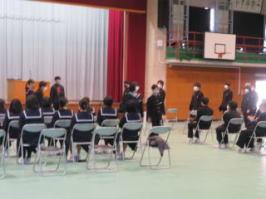 ◇3月24日(金)<令和4年度修了式【1・2年生】>![]() ![]() ![]() ◇3月23日(木)<お花訪問【2年生】> ・2年生が「トライやる・ウィーク」でお世話になった事業所にお花を贈呈しました。 ![]() ![]() ![]() ◇3月23日(木)<大掃除:ワックスがけ【全校生】> ![]() ![]() ![]() ◇3月17日(金)<模擬面接【2年生】> ・先週の模擬入試に引き続き、模擬面接を2グループの2班に分かれて、実施しました。 (Aグループ:面接官【校長・夜久先生】・Bグループ:面接官【教頭・太田先生】 ![]() ![]() ![]() ◇3月15日(水)<職業調べ発表会【1年生】> 各自、来年の「トライやる・ウィーク」に向けて、総合の時間に調べた職業について発表を行いました。 ![]() ![]() ![]() ![]() ![]() ![]() ![]() ![]() ![]() ◇3月10日(金)<東日本大震災 追悼式【全校生】> 明日、東日本大震災の発生から12年を迎えます。この震災で犠牲となられた多くの方々のご冥福を祈り、 復興への誓いを新たにするため追悼集会を開催しました。 ![]() ![]() ![]() ![]() ![]() ![]() ◇3月10日(金)<模擬入試【2年生】> <目的> @3年生の入試の時期に合わせて実施することで、来年の受検を意識させる。また、今後1年間の生活をより一生充実させるために努力する 姿勢を育む。 A学習では、日々の授業にしっかりと取り組ませる。また、生活面では、中学生らしい身なりや言葉遣いをすること、遅刻や忘れ物をしない ことの大切さについて改めて考えさせる。 B願書記入、面接体験などを通し、進路選択をより現実的に捉える機会にする。 ![]() ![]() ![]() ![]() ![]() ![]() ![]() ![]() ![]() ◇3月9日(木)<寄贈:朝来市社会福祉協議会> 朝来市社会福祉協議会から令和4年度朝来市善意銀行の取組として、市内の各学校に置き傘を寄贈 ![]() ![]() ◇3月8日(水)<第76回卒業証書授与式> *詳細は、学校行事を参照。 ![]() ![]() ![]() ◇3月6日(月)<卒業式練習【全校生】> ![]() ![]() ![]() ◇3月3日(金)<卒業式練習【在校生】> ![]() ![]() ![]() ◇3月3日(金) <3年生を送る会【全校生】> *詳細は、生徒会ページを参照。 ![]() ![]() ![]() ◇3月2日(木)<卒業式練習開始> ![]() ![]() |