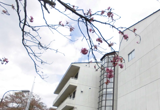 ![]() <市川南から見た校舎> <新緑映える校舎裏側> |