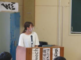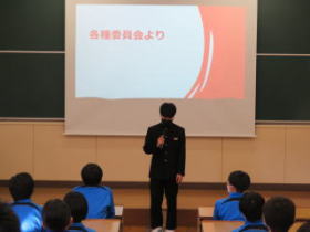 ・本年度、最初の生徒集会。1分間スピーチや生徒会執行部、文化図書委員会からの報告がありました。