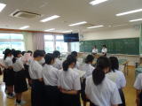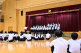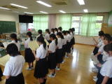 <生徒集会(全校生)> 各委員会からの一学期の取組等の表彰がありました。また、ALTのドロレスが今年に夏に帰国の為、離任のあいさつをいただきました。最後に、体育祭に向けての団編成発表と各団のリーダー紹介がありました。 |